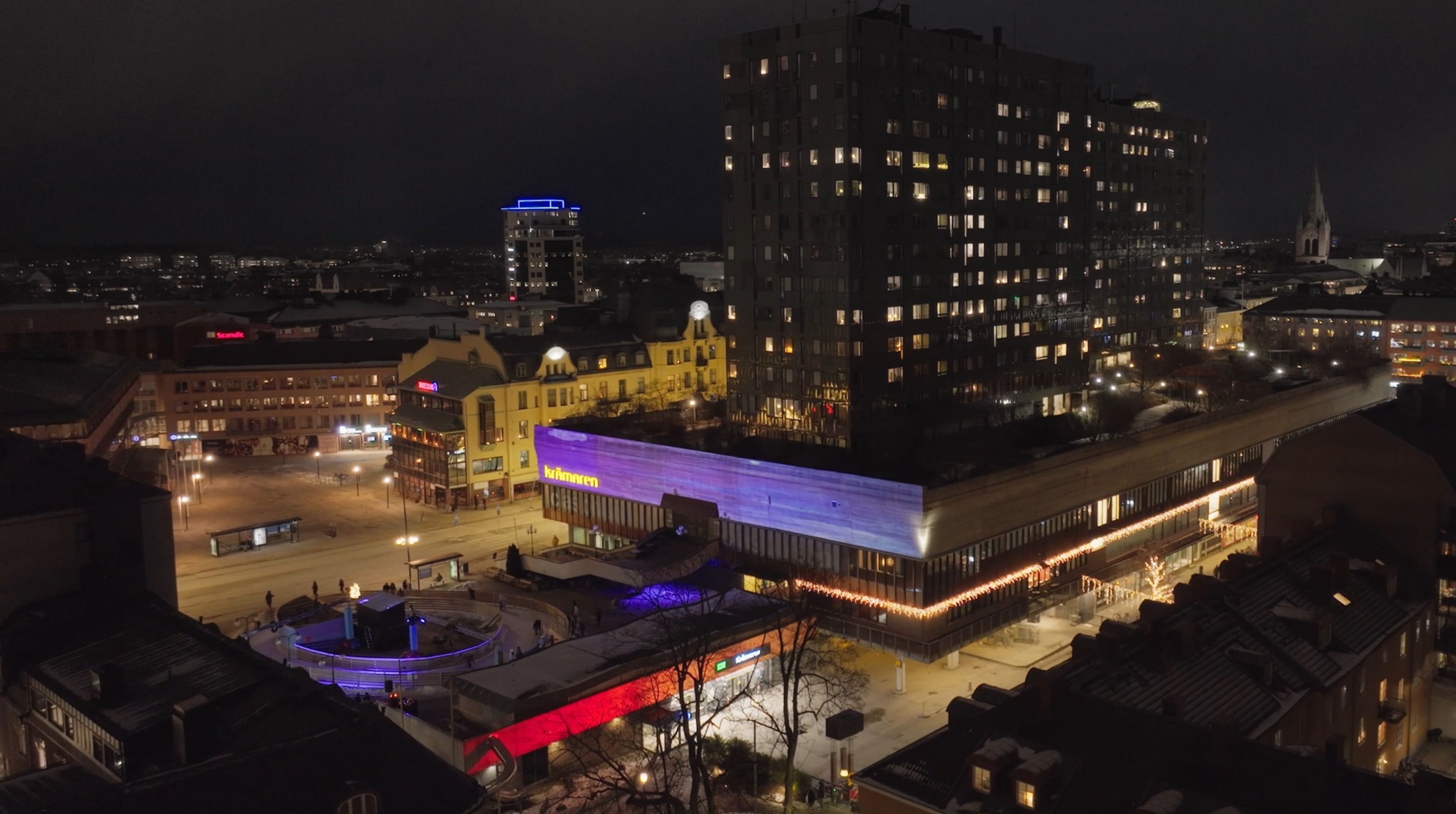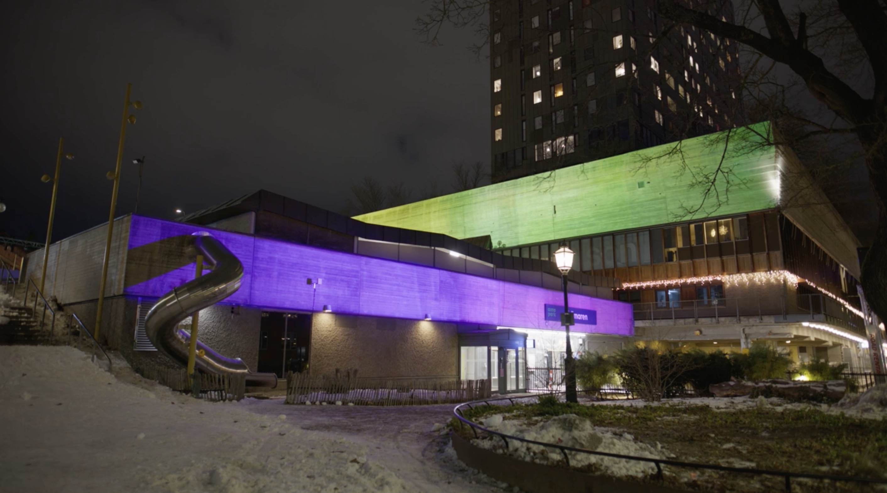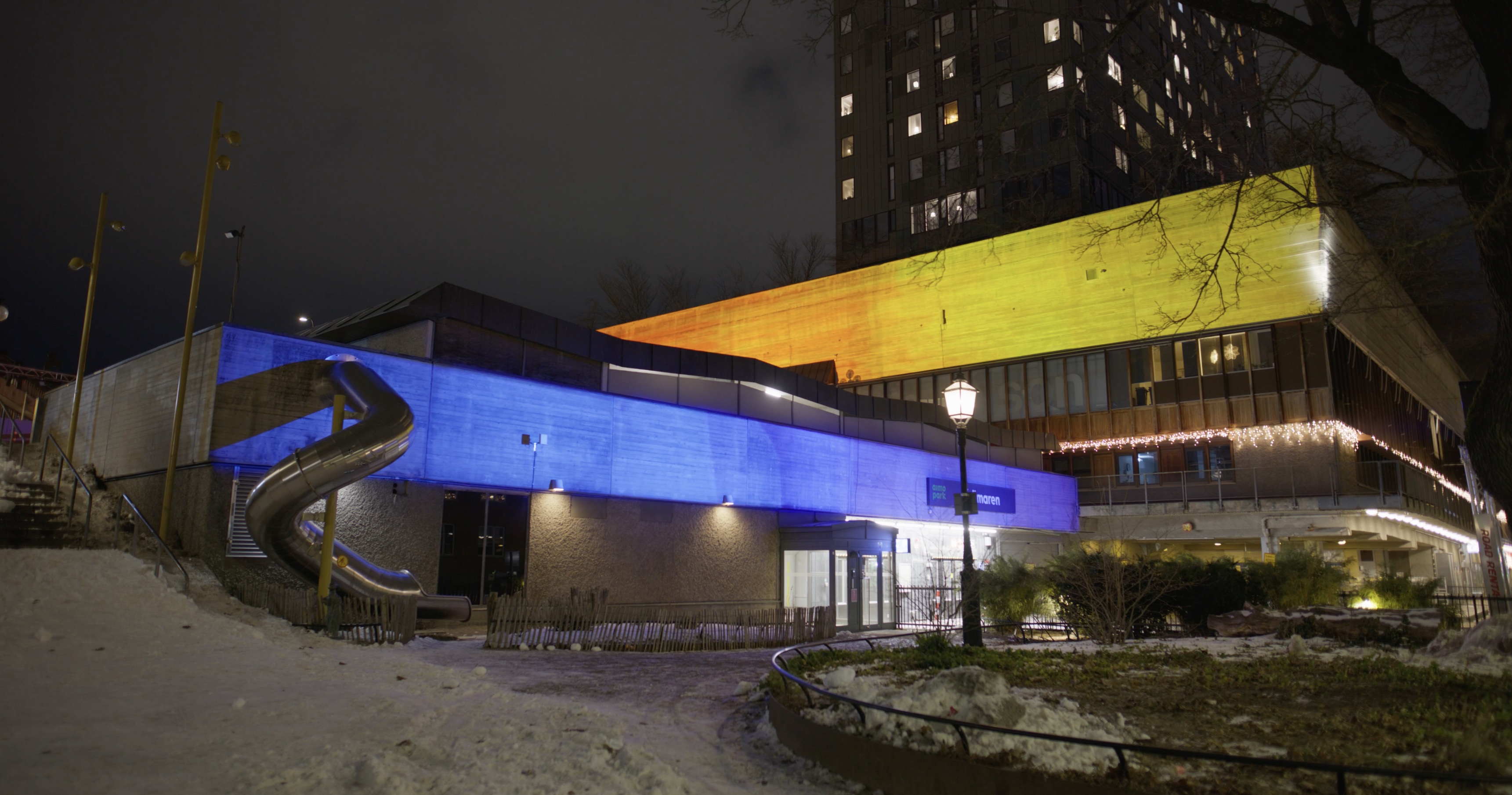 In a celebration of Krämaren’s iconic architecture and the life that moves through it, a long aquarelle drawing travels slowly across the facades, letting the concrete walls shine with new environments.