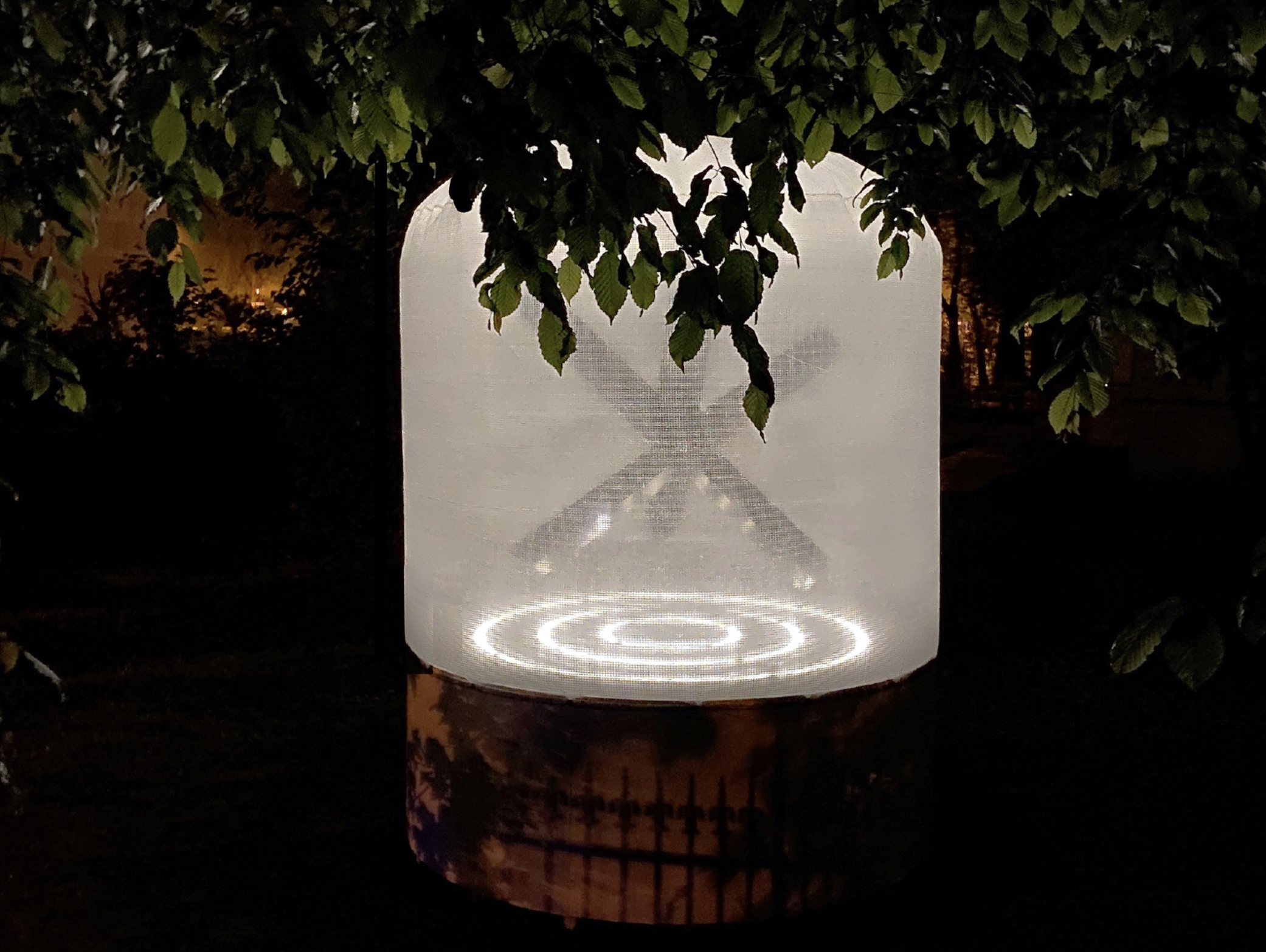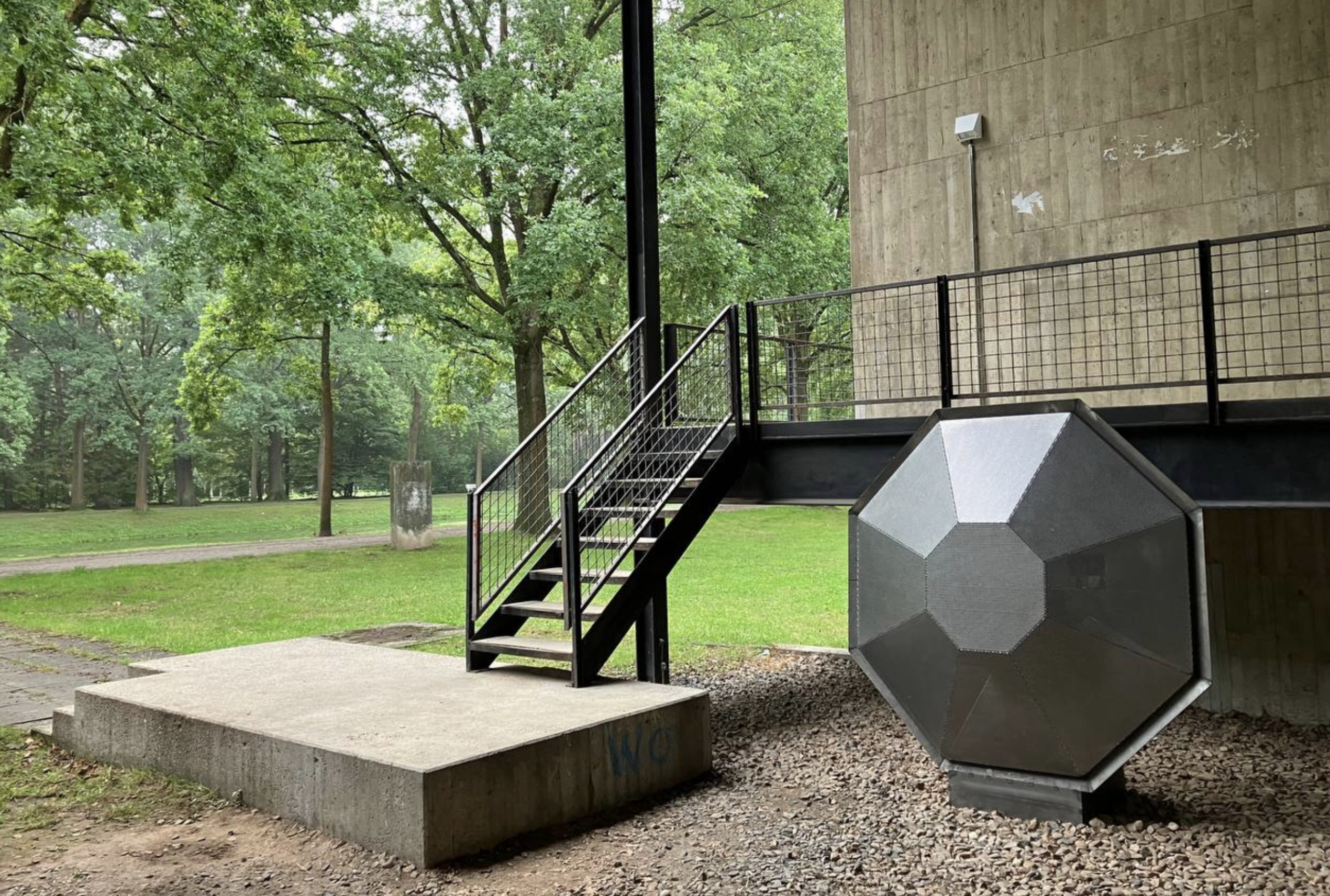 This permanent sculpture, part of documenta fifteen, stands in Karlsraue Park, adjacent to the Kassel Art School's Department of Sound. At 2 meters tall, the metallic form houses high-definition speakers and a subwoofer behind a perforated steel panel, broadcasting curated audio works. The integration of sound transforms the space, merging visual and auditory experiences.